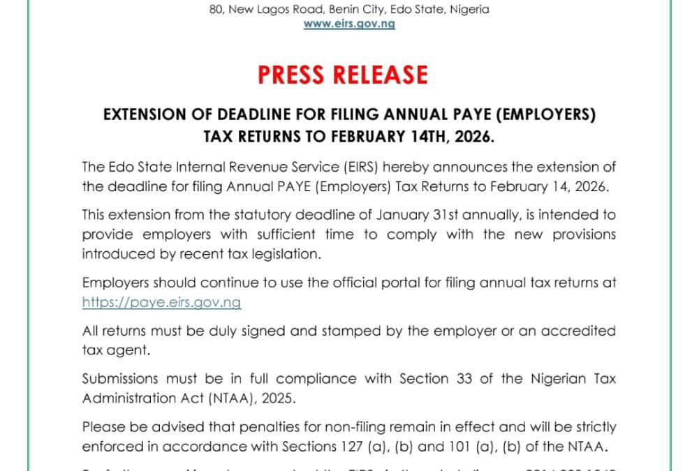 The Edo State Internal Revenue Service (EIRS) hereby announces the extension of the deadline for filing Annual PAYE (Employers) Tax Returns to February 14, 2026.